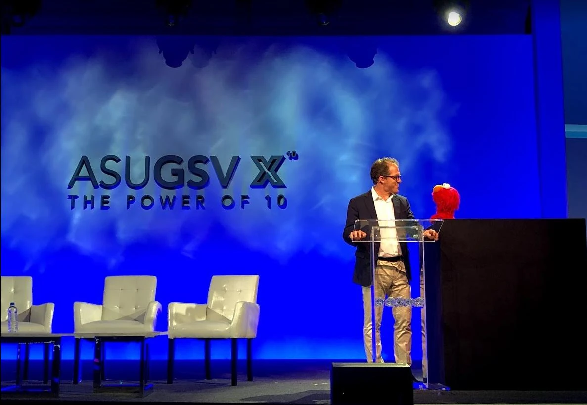 Elmo appeared alongside Sesame Workshop's President of Media & Education and COO Steve Youngwood at the tenth annual ASU+GSV Summit in April 2019.