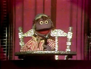 On a metallic high chair, a Lavender Anything Muppet infant, accompanied by two Hot Pink AM baby back-up singers, dances and sings about being a baby.