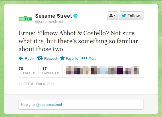 - On February 4, 2011, Ernie tweeted, "Y’know Abbot & Costello? Not sure what it is, but there’s something so familiar about those two…" [1]