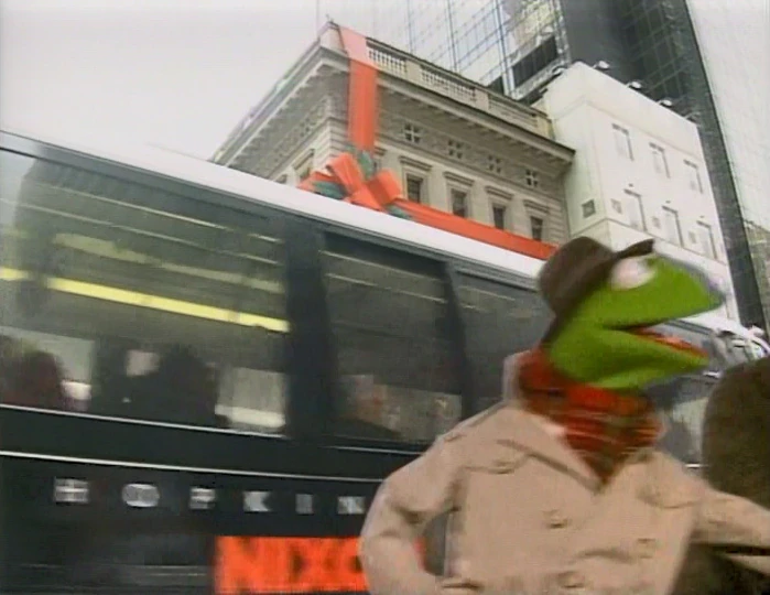 - During Reporter Kermit's segment in Elmo Saves Christmas, a bus passes by behind Kermit adorned with a poster for the 1995 movie Nixon featuring Hopkins' name sprawled across the top.