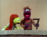 The rhyme was performed as a song in the first season of Sesame Street, to illustrate the number 7. Two Anything Muppets, a Purple boy (performed by Jim Henson) and a Green girl (Frank Oz), test each other's wits as he tries to get her to solve the riddle. She ends up turning the tables on him by revealing how many were going the other way (a total of 2,801). (First: Episode 0045)
