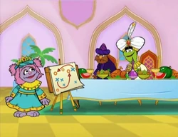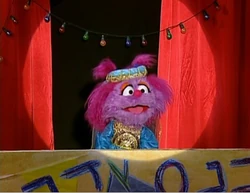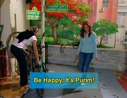SCENE 3 | In the evening, the residents of Rechov Sumsum (including Mahboub, Sivan, Grover, Gladys the Cow, family members from Les Matazarables, Kobi, Shoshana, Lemlem, and Boris) has gathered for the talent show. For the first act, Anneliese introduces Abigail, who is dressed as Queen Esther from the story, ‘’The Book of Esther’’. Abigail retells the story and every time she mentions Haman’s name, the residents use their noisemakers to show how angry they are at Haman. In the second act, Brosh does a tap dance while dressed as a hamantash. At the end, he trips and falls down, but he claims that he meant to do that. |