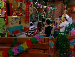 SCENE 3 cont'd | In the final act, a traditional Purim song was sung by a masked singer. After the song ended, the masked singer took off his mask to reveal it was Moishe Oofnik. When Moishe Oofnik is crowned the winner, Moishe wants the filling of his hamantash to be stinky cheese and anchovies. Moishe explains that eating it would make his bad breath would keep people away from him. Anneliese ends the talent show as the residents celebrate by dancing together in the street. |