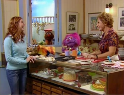 SCENE 1 | Anneliese welcomes the viewers and then suddenly smell something delicious in the air. She follows the smell to Shoshana’s local coffee house where Abigail and Shoshana are making hamentashen, a filled-pocket pastry, for Purim. Shoshana tells Anneliese that they are going to hold a talent show for this year’s Purim spiel and the prize is a king-size hamantash with any filling of the winner’s choice. Anneliese sees Moishe Oofnik walk by and tells him about the talent show, but Moishe says he will be busy: not going to the Purim spiel. Shoshana asks Anneliese to be the host of the talent show and Anneliese agrees, saying she would love to do it. After Anneliese and Abigail leave to prepare for the evening, Shoshana goes back to working on the hamentashen. |