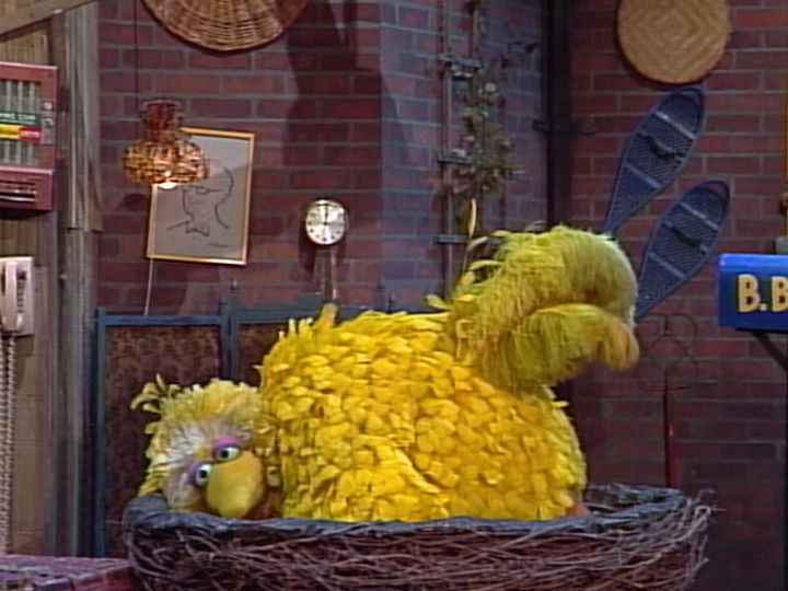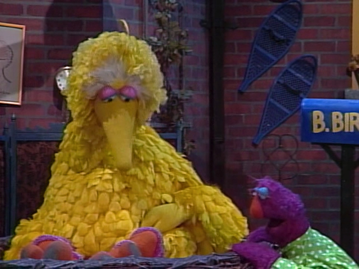 FRAME 6 | Big Bird observes that he and the viewer are the only ones up. He decides to restart his talk on sleeping methods, but he quickly drops off to sleep before he can finish. A lullaby version of the theme plays as the credits roll. |