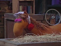 FRAME 5 | Buster the Horse is bewildered at the way Big Bird and Telly are sleeping. Susan comes to the window, and Buster informs her of how a horse like him sleeps. Despite Susan's doubts, Buster falls asleep while standing up on all fours. |