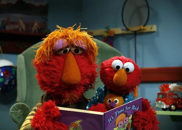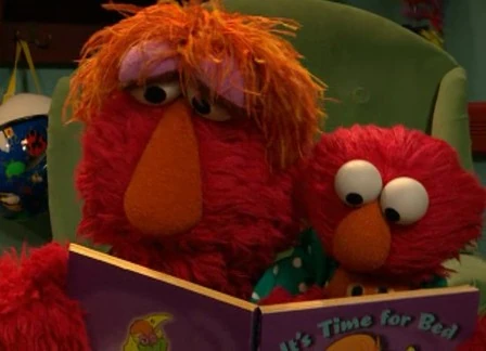 FRAME 2 | Elmo takes out his favorite book for his dad to read. The book is called “It’s Time for Bed”, a book about a monster who finds where he sleeps. |