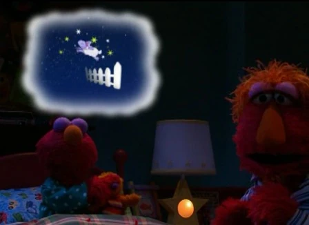 FRAME 6 | Elmo wakes up again and calls his daddy back in, but this time it’s Baby David who can’t sleep. Louie names things that can help David fall asleep. He lists counting sheep and Elmo and David close their eyes and count, but David can’t count higher than 3 sheep. Elmo then remembers another method – a lullaby. He remembers a time his friends did the same. |