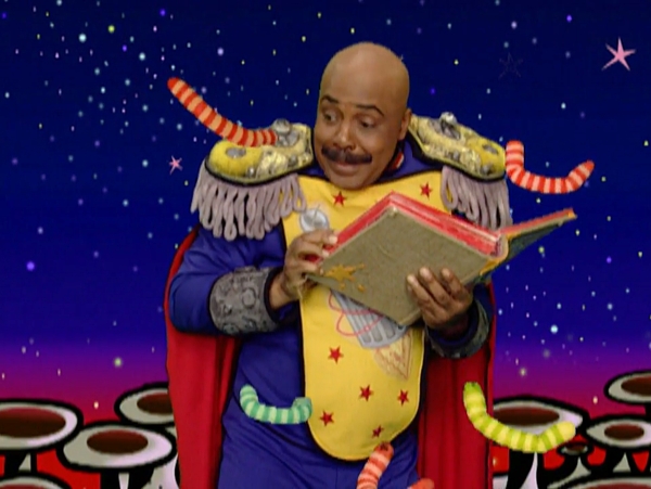 Insert | Oscar reads Slimey another chapter of "The Adventures of Trash Gordon". This chapter, Trash combats of a gang of worms by reading them to sleep from a book of his own adventures. |