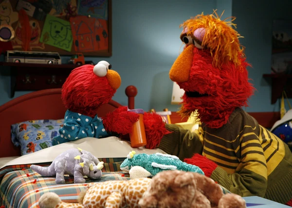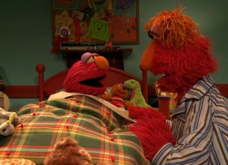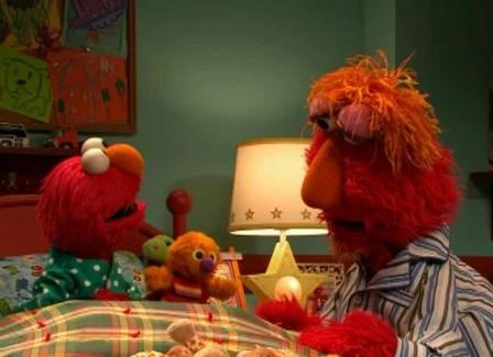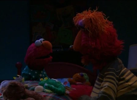 FRAME 7 | Elmo finishes his lullaby for David, putting his doll to sleep. Elmo still wants to sleep and admits that he really just wants his mommy and daddy around all the time, even at night. Louie explains that the night goes by fast and it will be morning before he knows it. They sing "See You Tomorrow" and Elmo finally goes to sleep. |