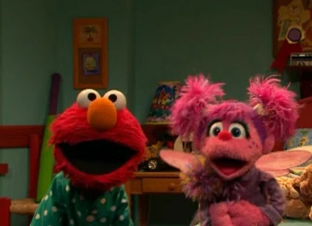 FRAME 4 | Elmo tosses and turns in his bed, not being able to sleep. He gets out of bed and wishes Abby was around to play with. She promptly poofs into his room in her pajamas. She reveals she can’t sleep either, because she’s has scary thoughts. Elmo convinces her to just think of Happy Thoughts and they sing a song about it. |