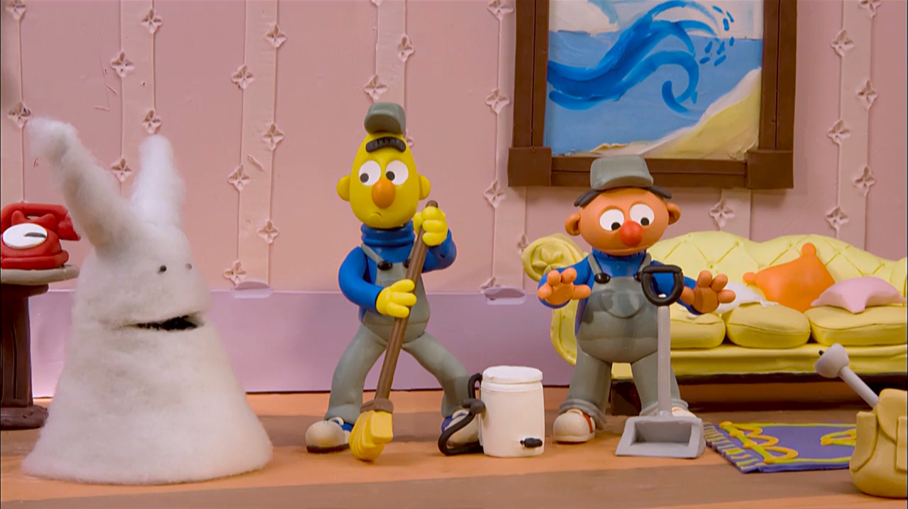 They're hired by a woman with a severe dust allergy to clean up her home. The dust has manifested in a cluster of dust bunnies who mischievously move their way around the room as Ernie and Bert try to clean them up: Ernie with his gadgets and Bert with a broom (all while displaying a reaction to the dust himself).