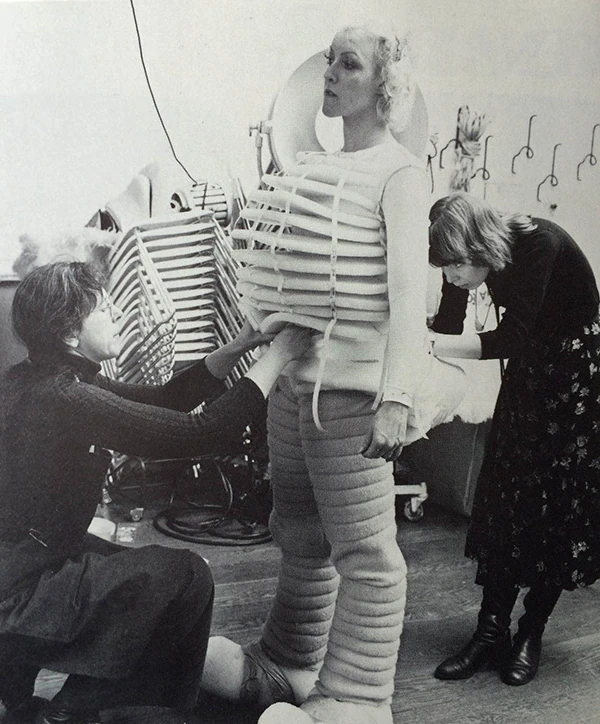 Baytos suiting up in the New York Muppet Workshop with assistance from Caroly Wilcox and Cheryl Blaylock.