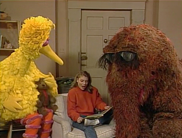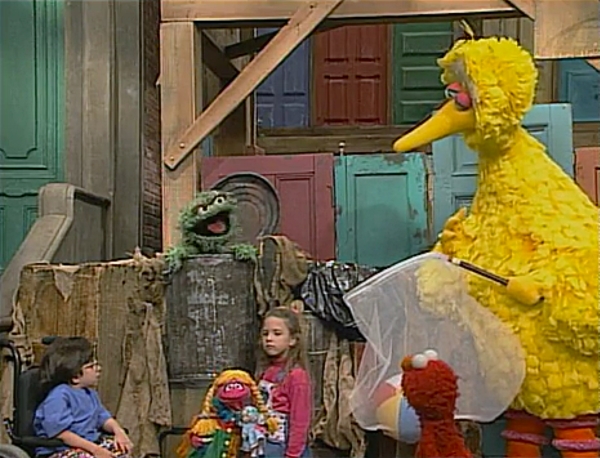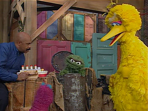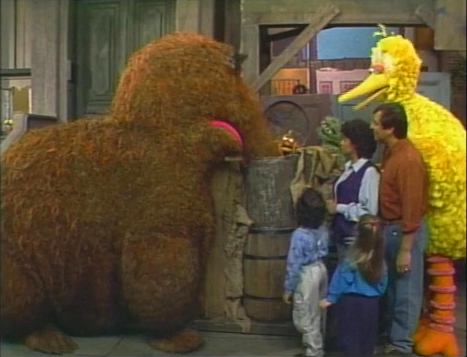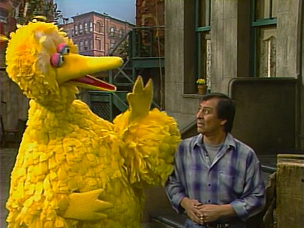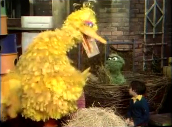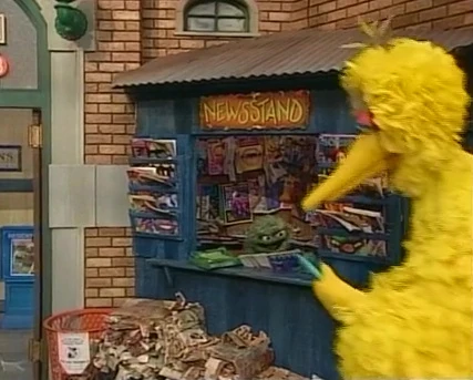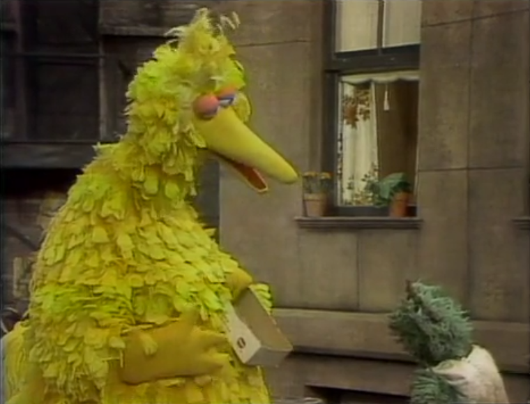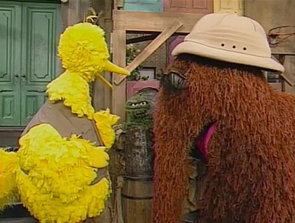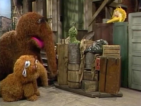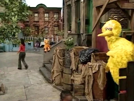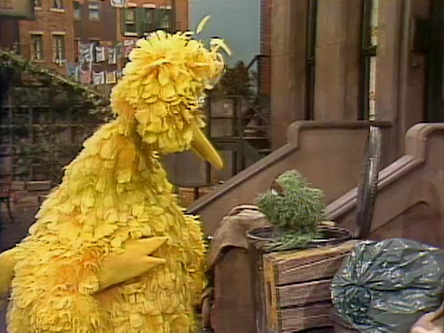 Big Bird hears Snuffy's voice and peeks from behind his doors. Snuffy tells Big Bird he's talking to Oscar, who responds "Yeah!" After Big Bird leaves, Caroll Spinney switches to performing Oscar. In the next scene, Big Bird has a conversation with Oscar. Oscar is partially heard in voice-over from inside his can, but he briefly pops up for a one-on-one with Big Bird when he describes how people stand around his can. The camera cuts from Oscar to Big Bird staring at him before cutting back.