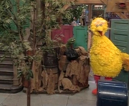 Oscar tells Big Bird to get lost, but Big Bird insists on waiting by the tree as per his plan to meet Snuffy. Oscar points out that there's another tree he could wait by, successfully convincing Big Bird to move.