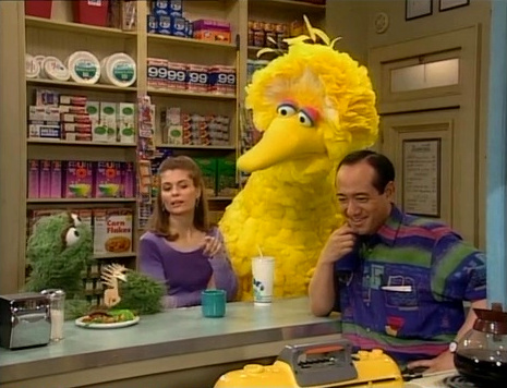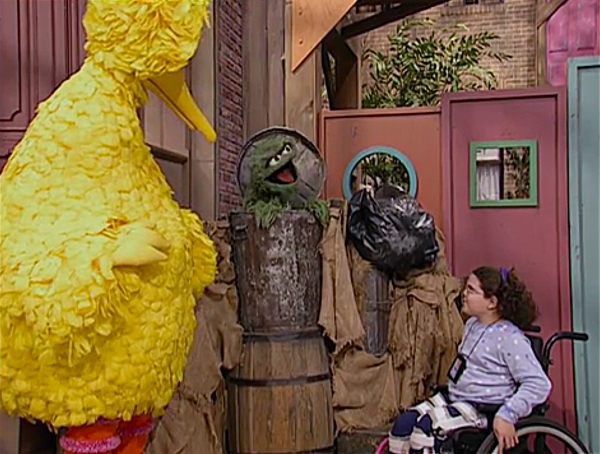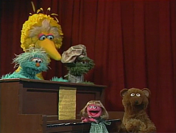 Big Bird (performed by Spinney) greets Oscar's Newsstand before greeting Oscar, who tells him to get lost. Later in Scene 4, both Big Bird and Snuffy introduce Jerome to Oscar and the Grouchketeers.
