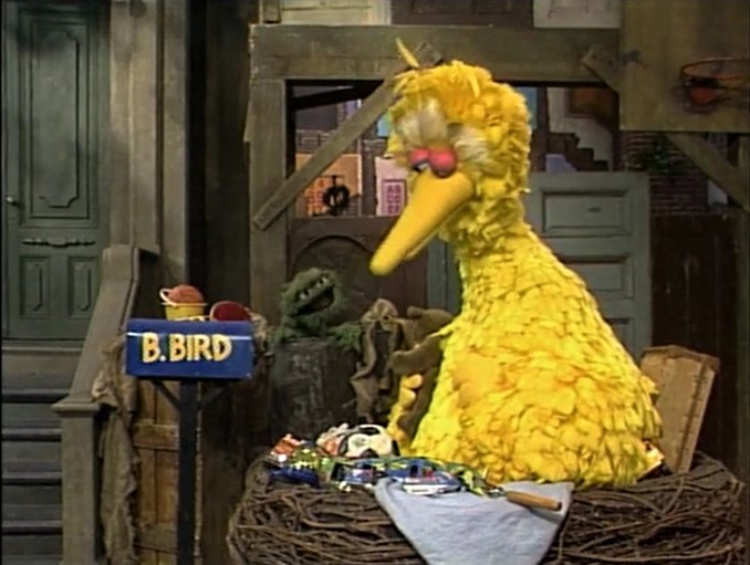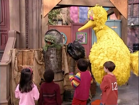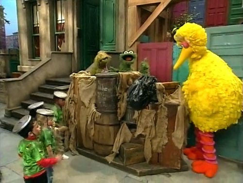 Part of Big Bird's introduction to the viewer of what a typical day on Sesame Street looks like includes Oscar being in a crummy mood and slamming his trash can lid.