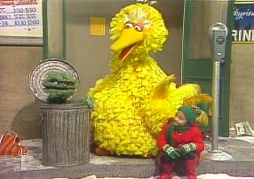 Caroll Spinney performs Big Bird throughout the entire street story except in this scene where Oscar asks for a show-and-tell invitation, just to turn it down.