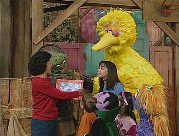 Telly is assigned to interview someone who lives on the Earth. Assembled are Big Bird, Forgetful Jones, Oscar (inside his can, with his arm only being shown) and a goldfish in its bowl. They all point out their respective homes, none of which they consider the Earth. Gordon overhears this and brings them a globe to show how they all live on the Earth.