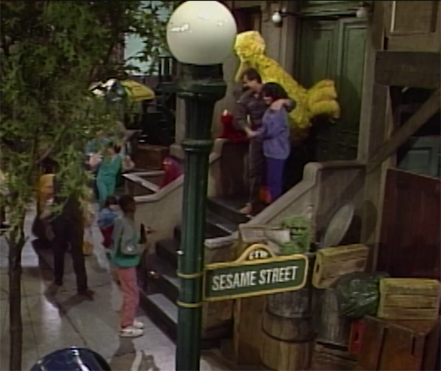 Although they aren't in the same shot together, Oscar appears with no audible dialogue while Big Bird comments on what's happening. The script credits Richard Hunt as performing Oscar in the scene, but it also originally staged the camera looking over the construction doors from Big Bird's perspective. The final scene as taped dropped this framing precluding the need for another performer.