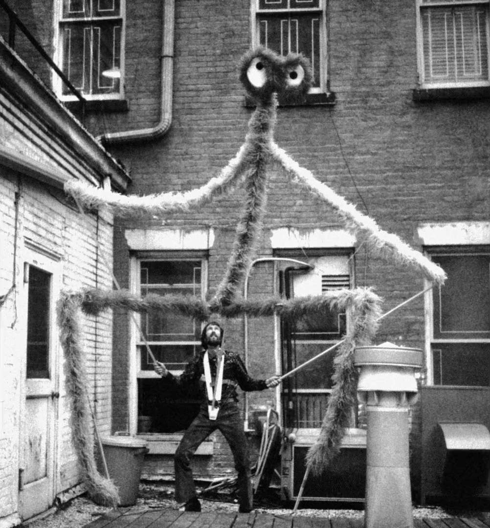 | Jim Henson demonstrates the puppet on the roof of his New York City office. | |