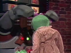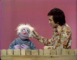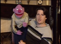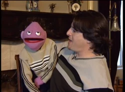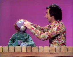 Sesame Street (First: Episode 0491) Bob asks a blank-faced Large Lavender Live Hand Anything Muppet how he feels. The Muppet answers, "I don't feel anything." Bob sticks a nose and angry eyes on the Muppet, who then starts to feel mad. He walks off in a huff, and we hear a crash off-screen. The Muppet comes back and ad-libs, "It's okay, Bob, I just dropped my watch!" |