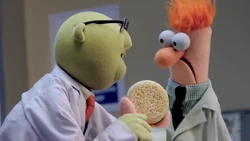 During 2008's A Muppets Christmas: Letters to Santa’s finale song "My Best Christmas Yet," Beaker is dancing with meeping model Petra Nemcova. Bunsen comes across the duo and happily exclaims, "Beaker, you came back!" asking Nemcova, "May I cut in?" She offers her hands to Bunsen, only to see him start dancing with Beaker instead. Nemcova, who is left standing alone, replies with a lugubrious "Meep, meep." |