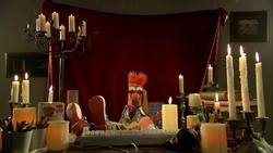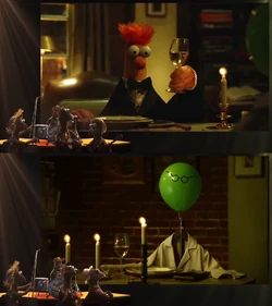 In 2015's "Flowers on the Wall" music video, a lonesome Beaker stages a pretend dinner date with a lime green balloon with painted-on glasses floating from a lab-coat hanger, standing in for Bunsen. The date quickly (and literally) goes up in flames through a series of mishaps. |