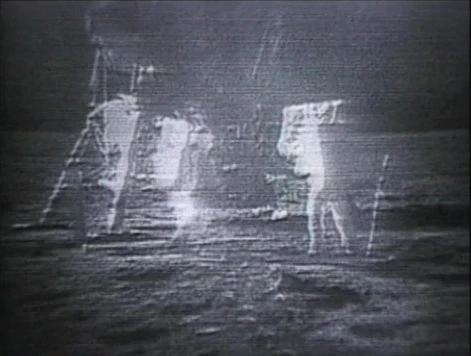 Archive footage of the Apollo 11 mission with Armstrong and Buzz Aldrin walking on the moon as shown on Sesame Street in 1998.