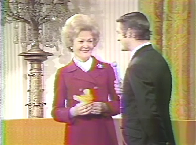Following the stage show, John Robbins chats briefly with Pat Nixon about the impact of Sesame Street as she boasts some stray Big Bird feathers she's collected from the evening.