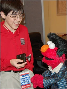 A young reporter from Scholastic News Online interviews Elmo at the Consumer Electronics Show.