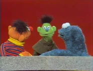 Soon, a Green Anything Muppet boy (Nelson) appears and settles the issue. He points out that while they're similar in some ways, Cookie Monster has blue fur and googley eyes, while Ernie sports a striped shirt, making them easy to tell apart. The pair are relieved, but now wonder who the boy is; he has hair like Bert, a coat like Sherlock Hemlock, and the green complexion of Kermit the Frog. "Maybe he Allen Ludden," wonders Cookie as the pair argue over the boy's identity.