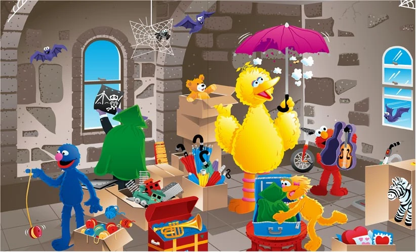 Elmo, Zoe, Big Bird, and Grover help the Count clean out his castle in an illustration by Ernie Kwiat.