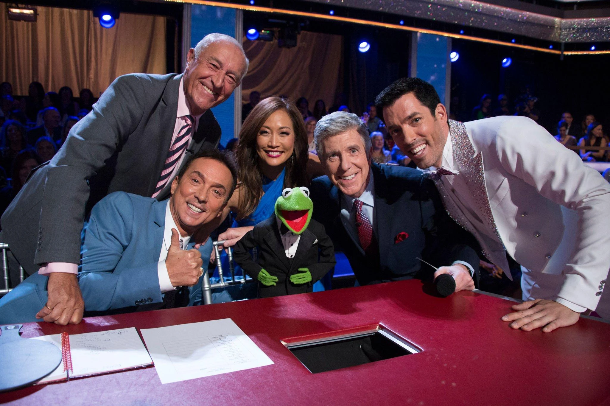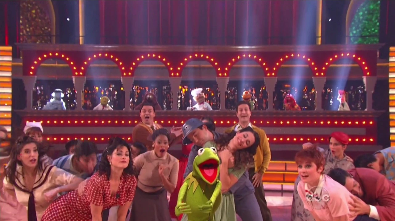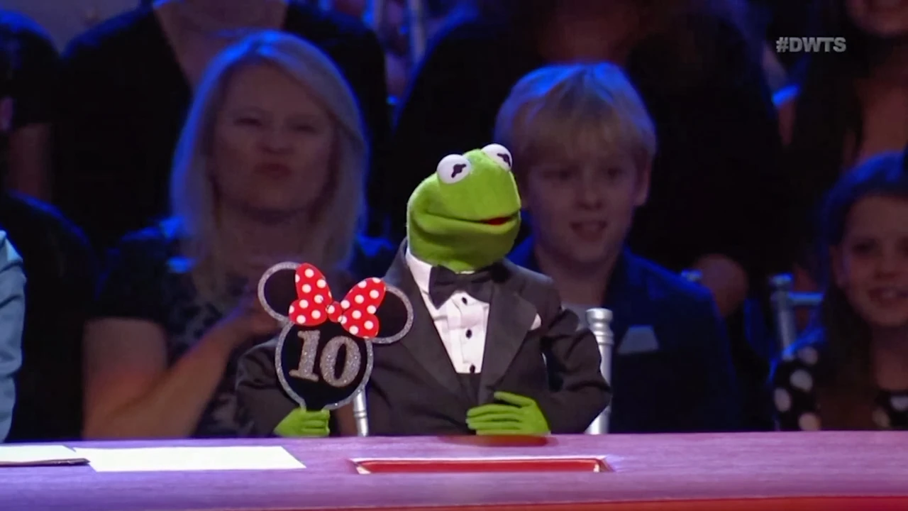 October 17, 2017 Kermit makes appearances throughout the show on Disney Night. Drew Scott and Emma Slater dance a Viennese waltz to "Rainbow Connection." The song was sung, offstage, by Felicia Barton, a former American Idol contestant. During the outro, Kermit can be heard singing along to the theme music of The Mickey Mouse Club. Tim Lagasse assisted Matt Vogel in performing Kermit for this appearance.[1] | ||