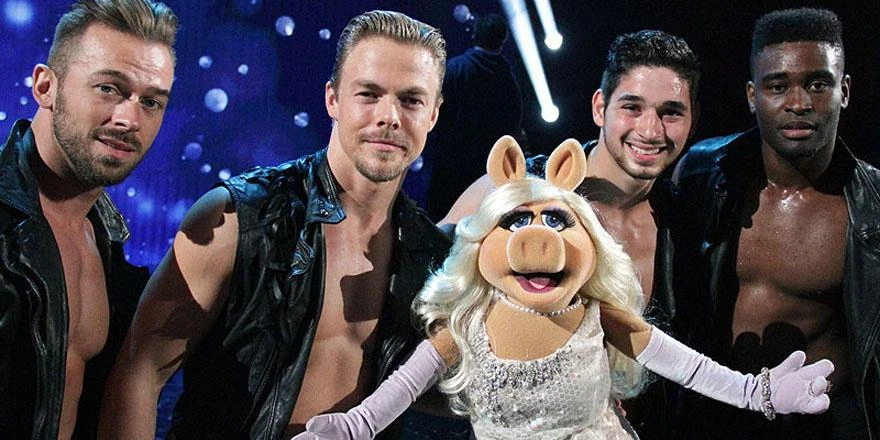 September 28, 2015 The Muppets (Kermit, Piggy, Fozzie and Scooter) appear to promote The Muppets. The show's "hot guys" do a brief sexy dance before commercial, and afterwards, Miss Piggy runs up to Derek Hough and kisses him on the chest. Hough is taken aback, but then appreciates the attention. A publicity photo shows Piggy and Hough in a romantic pose. | ||