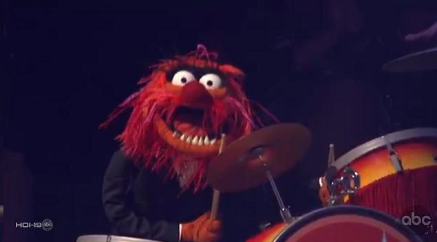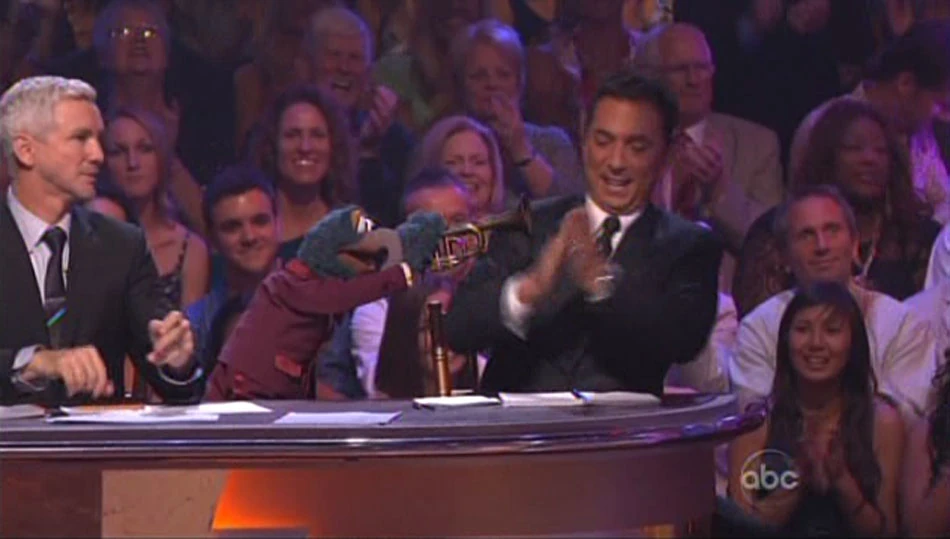 September 28, 2009 Animal appeared before Aaron Carter's and Karina Smirnoff's dance playing the drum intro to "The Muppet Show Theme." Gonzo blew the trumpet at the judges' table at the end of the number, into judge Bruno Tonioli's ear. In the interview before the scores, Samantha Harris and Karina make a passing reference to Kermit the Frog and Miss Piggy. (The same routine was performed on The Ellen DeGeneres Show.) | ||