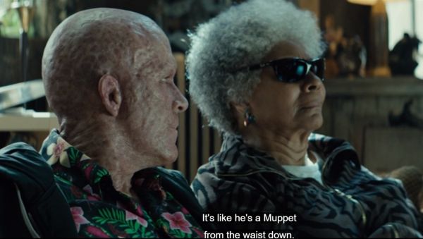 - A longer (and more explicit) Muppet analogy occurs in Deadpool 2 (2018). Deadpool sits in his apartment naked aside from a shirt, exposing his regenerating lower half. Asked by Blind Al to describe the sight, Weasel says "It's like he's a Muppet from the waist down. But this time, you can see the Muppet's dick. Grover's got a cock the size of a..."