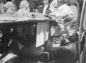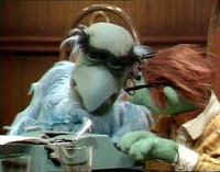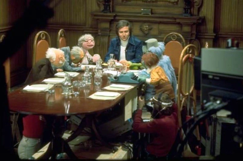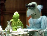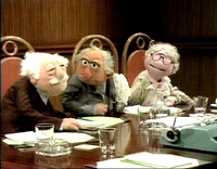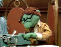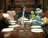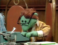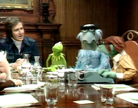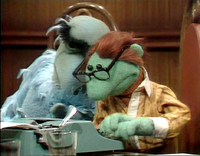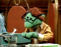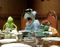 Joining Des around a table were Kermit the Frog (who refers to himself as the executive producer of Des' show), Hilda ("costume mistress"), George the Janitor ("the janitorial engineer"), Waldorf (mostly asleep, and referred to as "Conrad Waldorf"), Sam the Eagle, and Wally, a green bespectacled Whatnot at a typewriter.