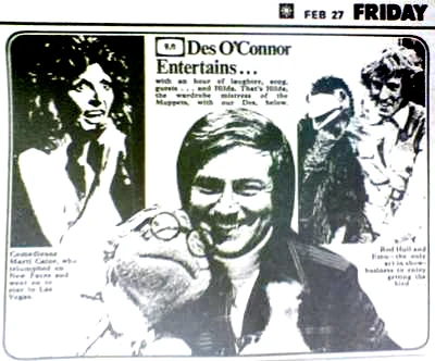 Des O'Connor Entertains was a variety show from the United Kingdom, hosted by Des O'Connor and featuring guest stars, singing, dancing and comedy sketches. The Muppets made a guest appearance on February 27, 1976 to promote The Muppet Show.