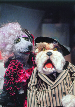 - Some puppeteers appear beneath the dogs during the crowd scene at the Dog House.