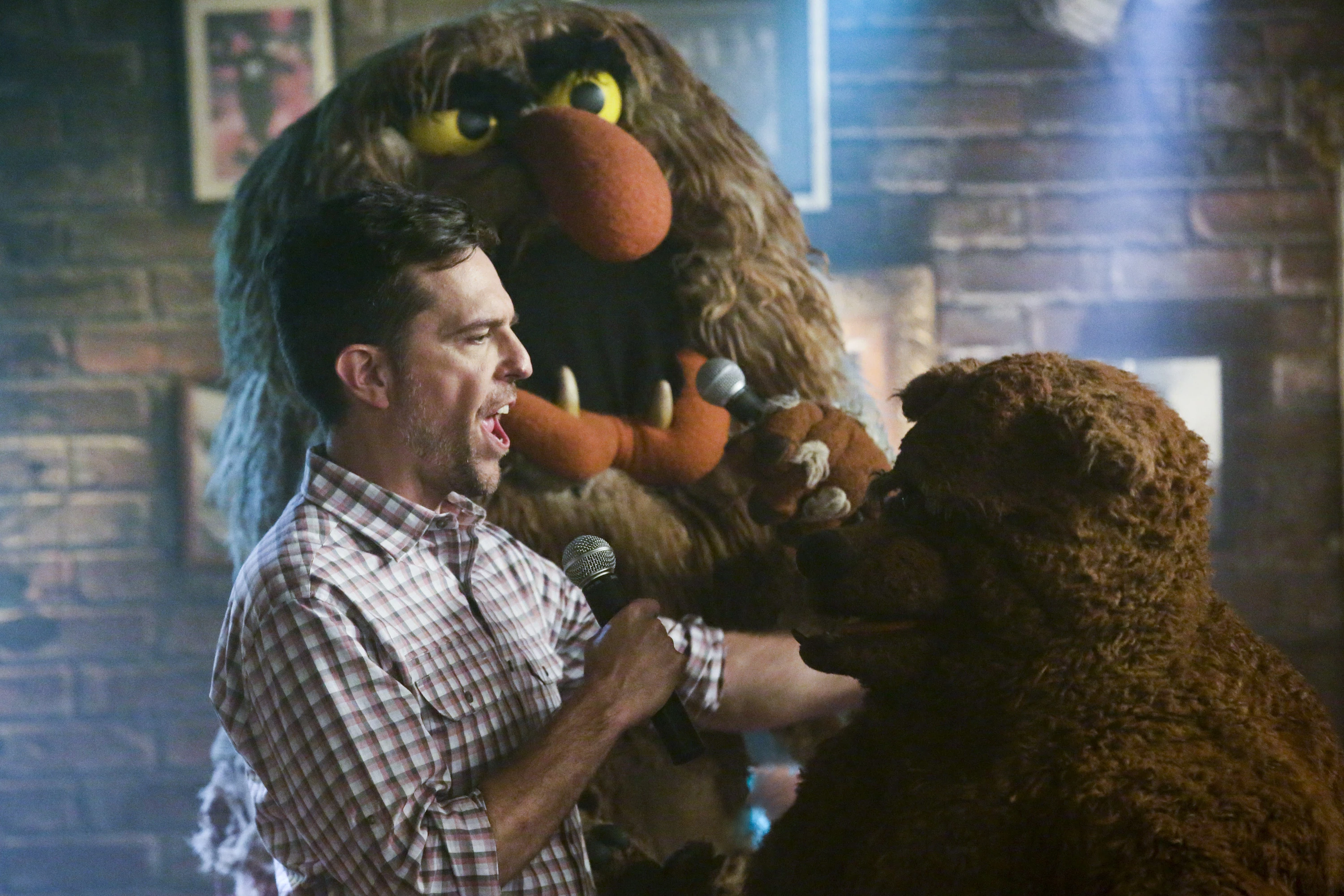 Ed Helms, Sweetums and Bobo the Bear sing the song during the office's karaoke night at Rowlf's Tavern in The Muppets episode "Pig Out."