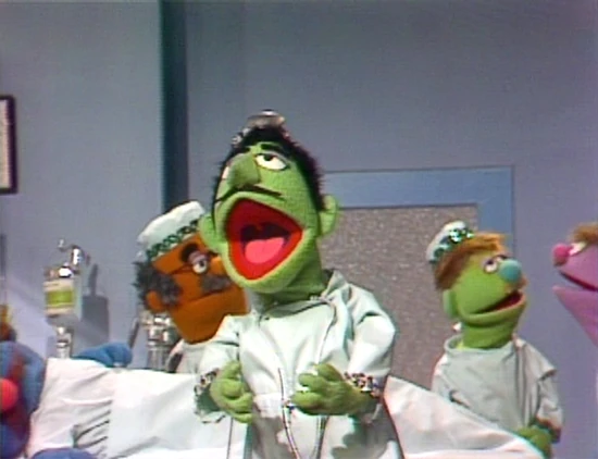 The group is led by Dr. Thad, a Green Anything Muppet, who is backed up by a trio of Green, Lavender, and Pumpkin doctors. A Fat Blue patient was featured in the number but was not a member of the Medications.