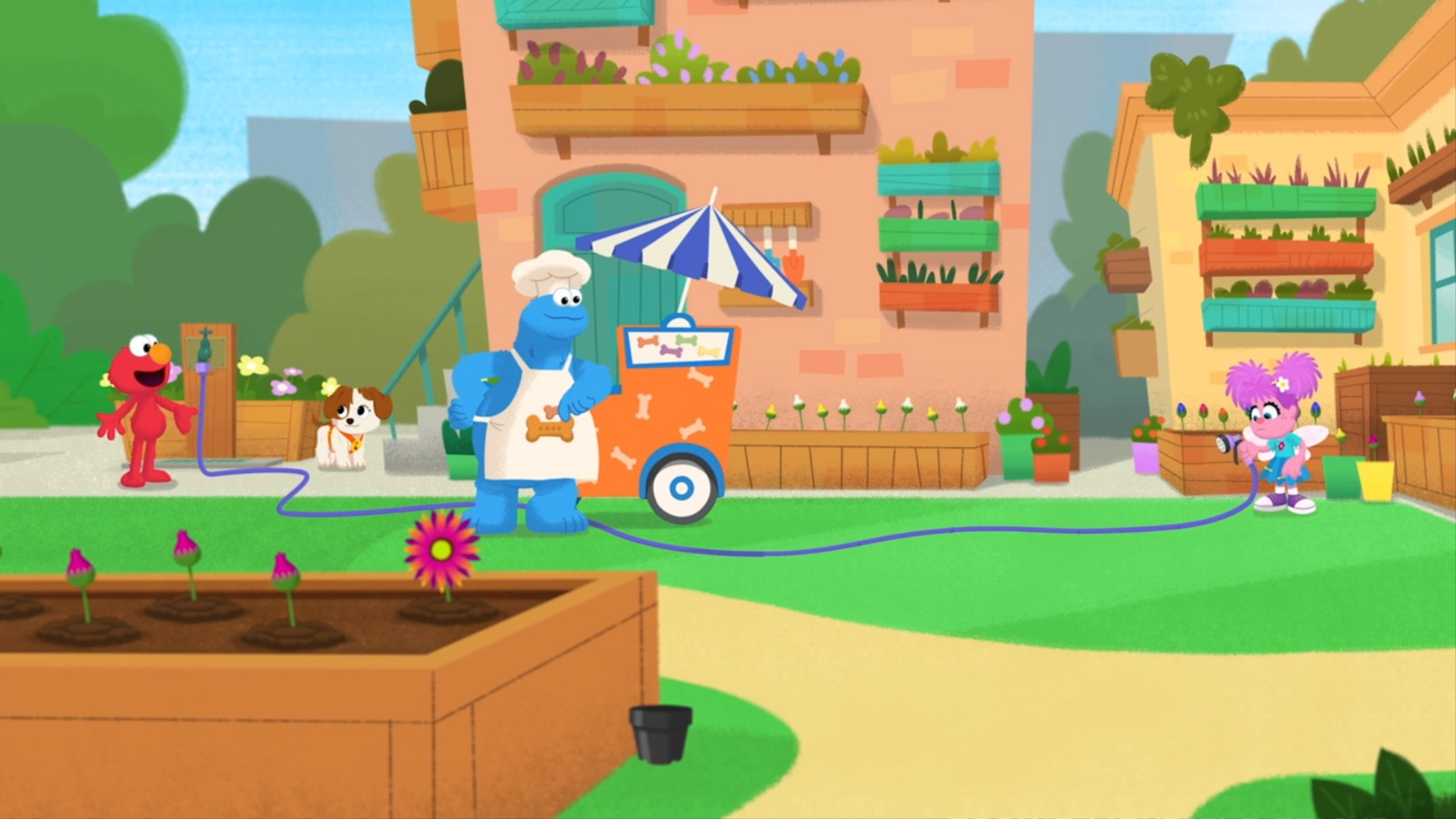 Elmo, Abby, and Tango plant seeds in the community garden. When Elmo and Tango look away, the hose suddenly stops working.