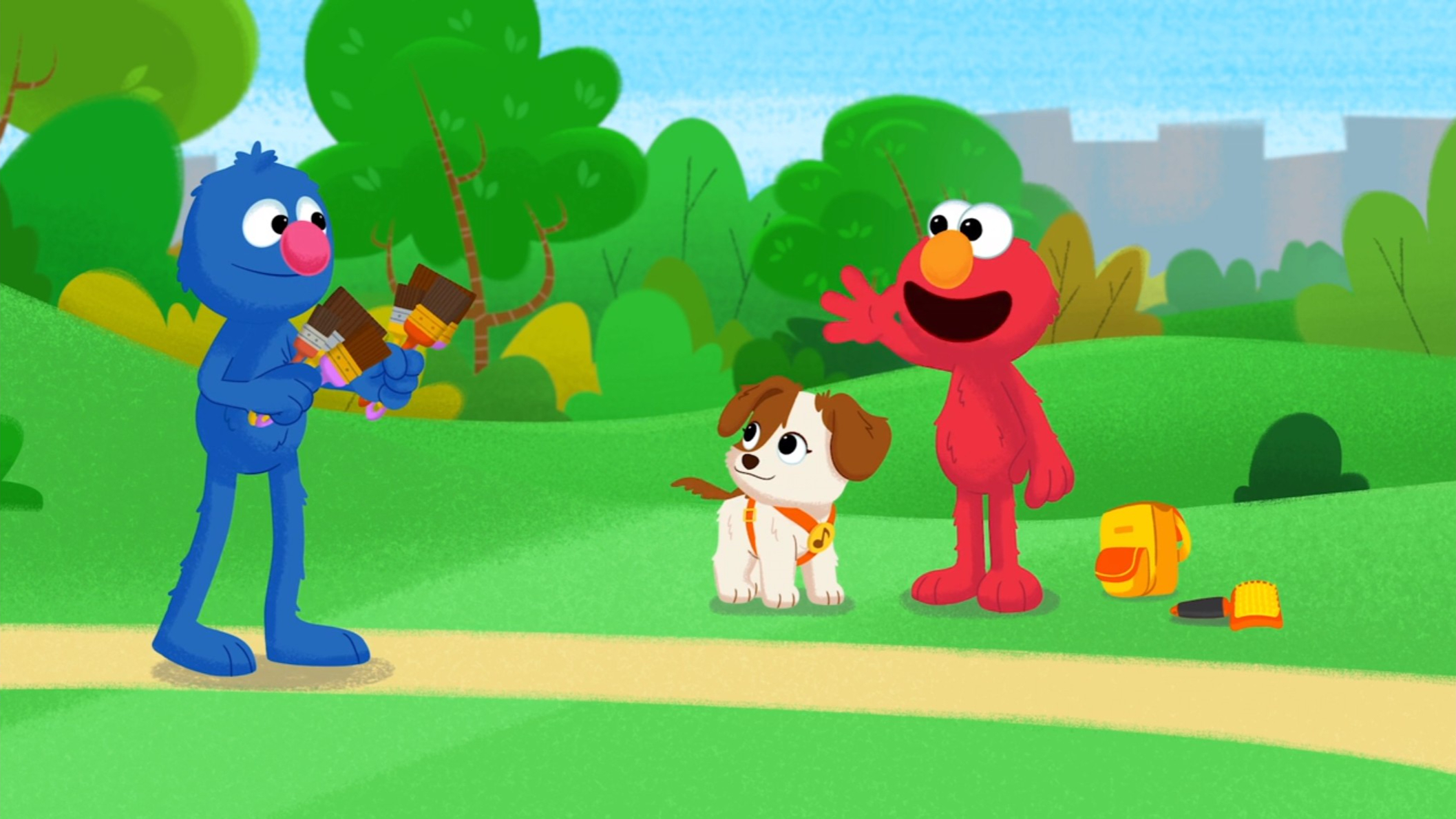 Elmo is brushing Tango when he sees Grover with a collection of paintbrushes at his disposal. Grover trips and falls, dropping his paintbrushes. He picks them up and walks away, but when he leaves, Elmo's doggie brush is nowhere to be seen. | |