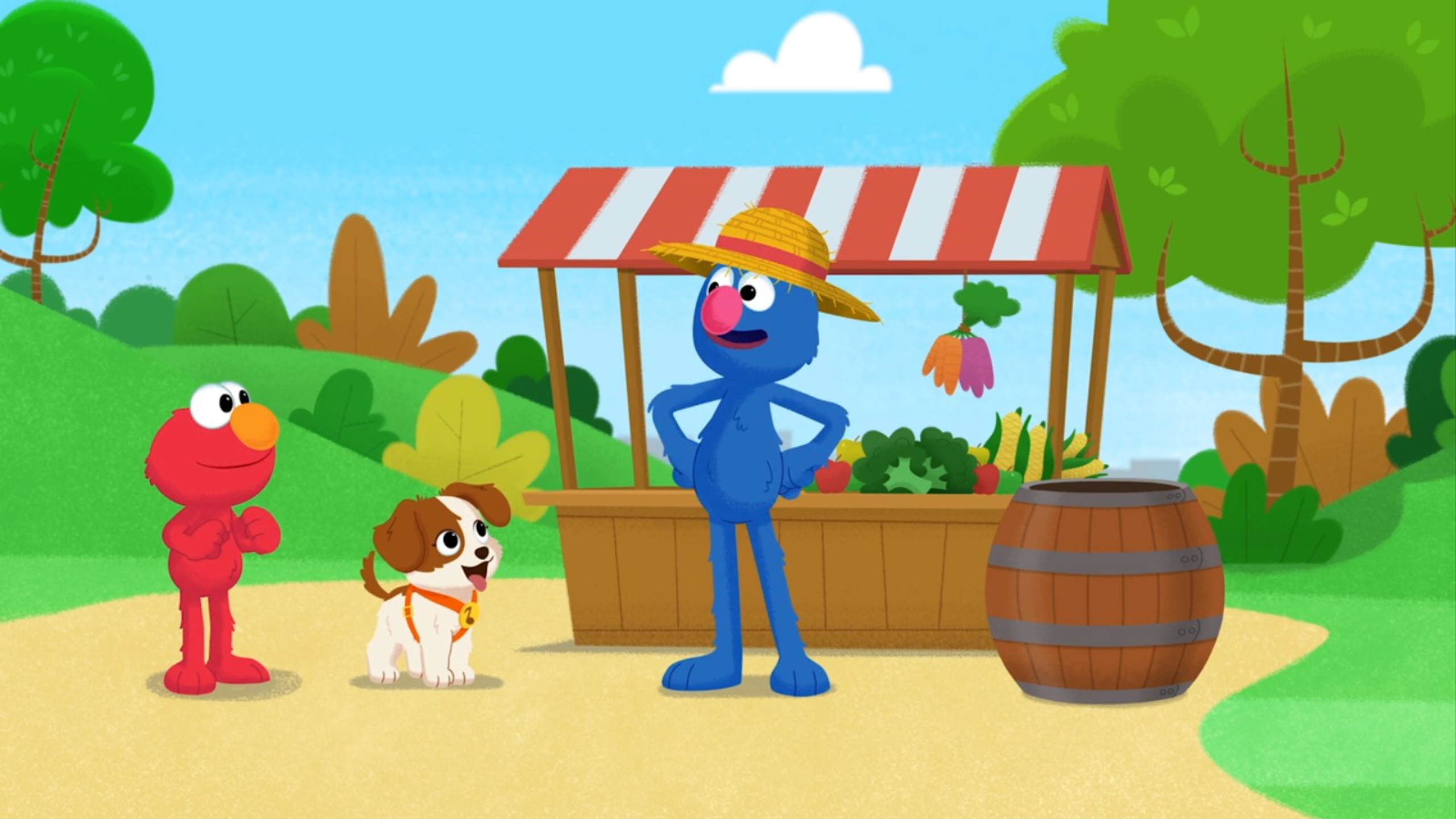 Elmo and Tango go on a walk where they meet Farmer Grover. Grover demonstrates that his straw hat is what makes him a farmer, but a second after he places it down, it disappears. | ||