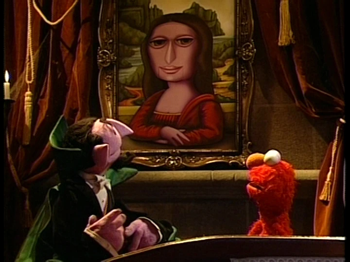 FRAME 2 cont'd | The Count and Elmo get a good laugh from Baby Bear's joke. Elmo tells another, which makes a painting of the Countess Groan-a Lisa (Martin P. Robinson) laugh as well. The Count assures Elmo he shouldn't be scared. Elmo shows he's well acquainted on the topic of being scared... |