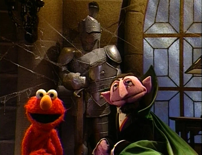 FRAME 5 | Elmo and The Count listen to a joke by his suit of armor, Sir Count-a-Lot (Joey Mazzarino), bringing the joke total to 8. |