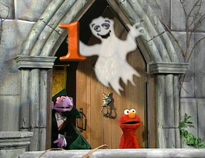 FRAME 1 | Elmo arrives at the Count's castle to tell him some spooky jokes and gets frightened by the surroundings. Elmo tries to knock, but the knocker activates itself. Before the Count opens the door, they exchange a knock-knock joke, making it the first joke on the Count's list, punctuated by an animated ghost holding the corresponding numeral. As the Count brings Elmo inside, the door shuts itself too. |