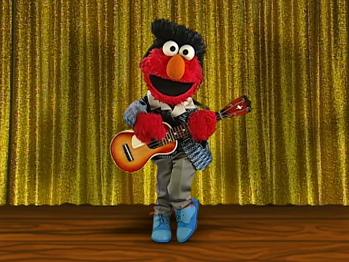 - Elmo appeared as Elvis in the Elmo's World "Singing" episode, performing an abbreviated version of "Blue Suede Shoes."