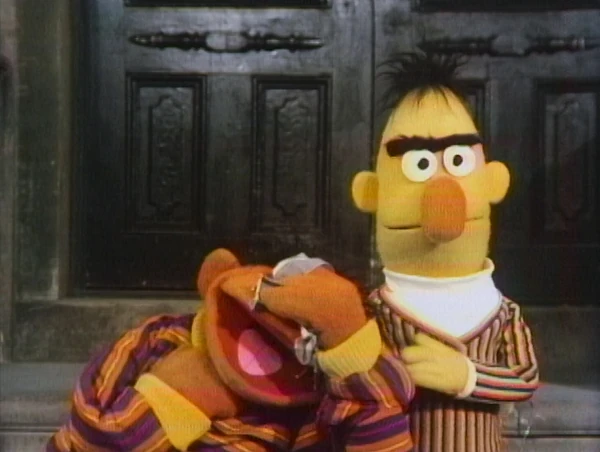 SCENE 1 | "Sally, you've never seen a street like Sesame Street. Everything happens here. You're gonna love it," says Gordon as he introduces his new neighbor, Sally, to Sesame Street. She meets Bob, Mr. Hooper, Susan, and some kids in the yard. A crash signals the arrival of Sesame Street's tallest resident, Big Bird, who has trouble seeing Sally due to how small she is. Gordon lifts Sally up to Big Bird's height, but this alarms the large fowl, who thinks she's eight feet tall. Big Bird realizes his mistake, and claims to have gotten so nervous, he nearly laid an egg. Gordon and Sally then hear singing coming from the basement apartment in 123 Sesame Street, which Gordon explains is where Ernie and Bert live. He also tells Sally that, if she can hear Ernie singing, it most likely means that he is taking a bath. |